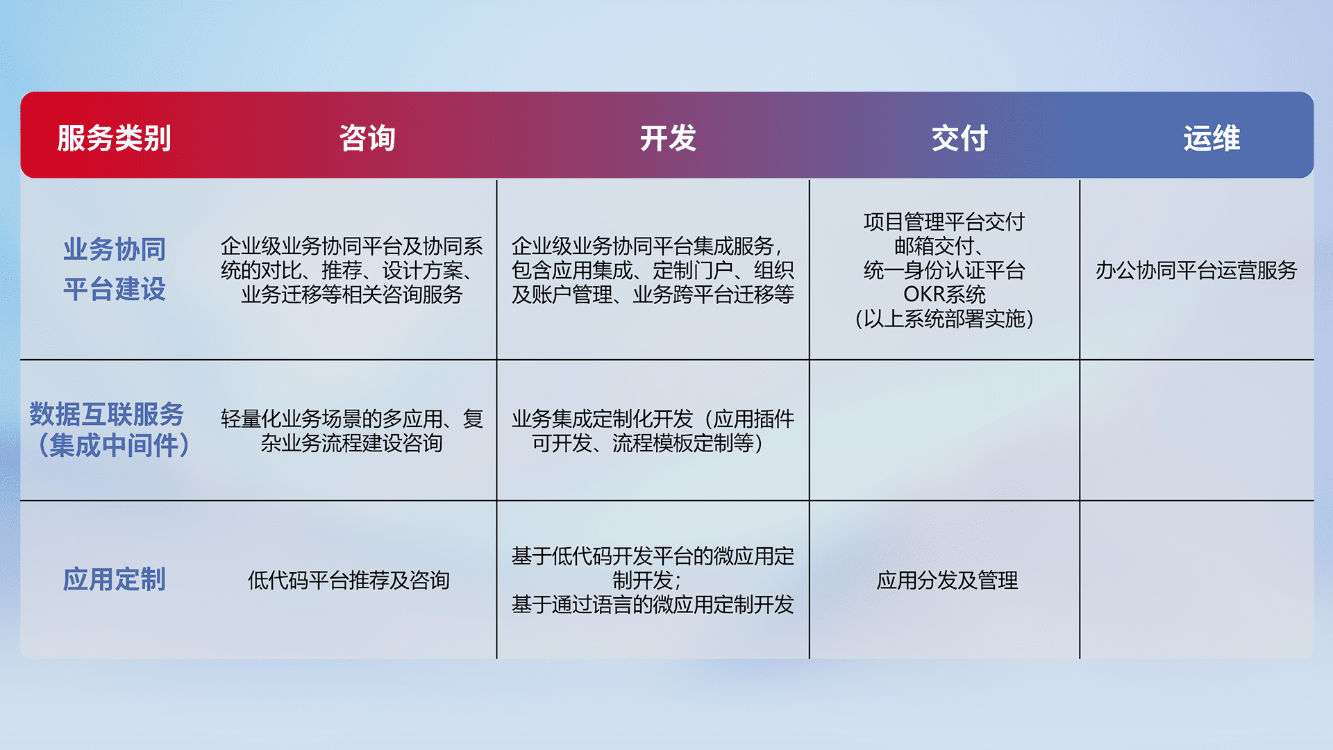 针对钉钉、、、企微、、、、IDaas等平台级产品提供产品的规划、、、方案、、、、交付、、、定制化开发等服务,,,实现如统一协同办公、、、、智能客户服务、、混合会议管理、、智能数据查询、、、、等业务场景,,实现数字化转型。。。。